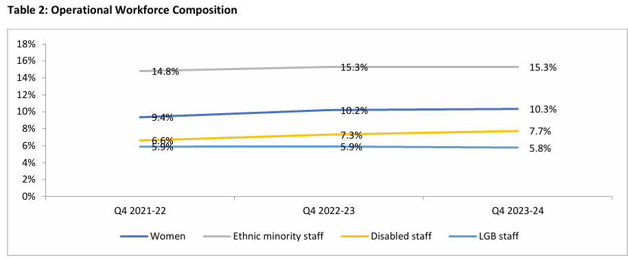 The LFB’s 2023-24 report states that amongst operational (frontline) firefighters, women represent 10.3% and ethnic minority staff 15.3%. Although the report shows that diversity is improving, frontline firefighting continues to face representation challenges. [7]