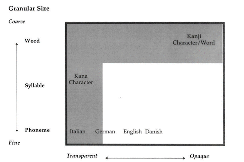The ‘Hypothesis of Granularity and transparency’, proposed by Wydell & Butterworth (1999), suggests that phonetic and logographic alphabets have lower instances of diagnosed dyslexia. As shown in Figure 2 below, Wydell & Butterworth (1999) categorized languages on a spectrum of transparency (degree of phoneme-to-grapheme correspondence) and granularity (how words are read in terms of unit size).